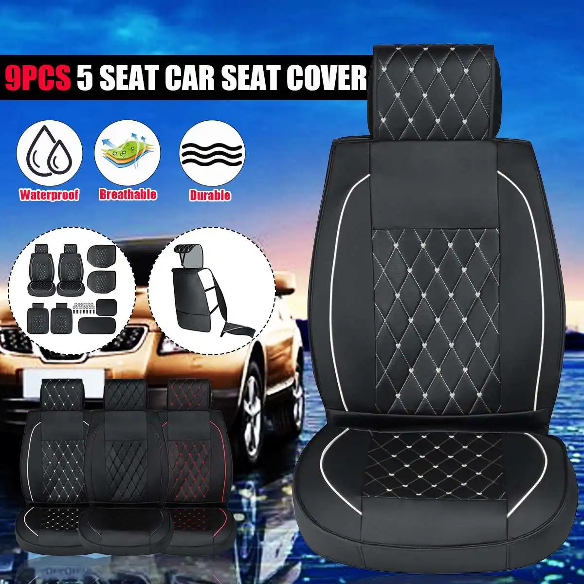 Product Name: 防水レザーカーシートカバー,パッド入りマット,ユニバーサル,フロント,バックレット,通気性,車用,バン,ダイヤモンド,縫製クッション